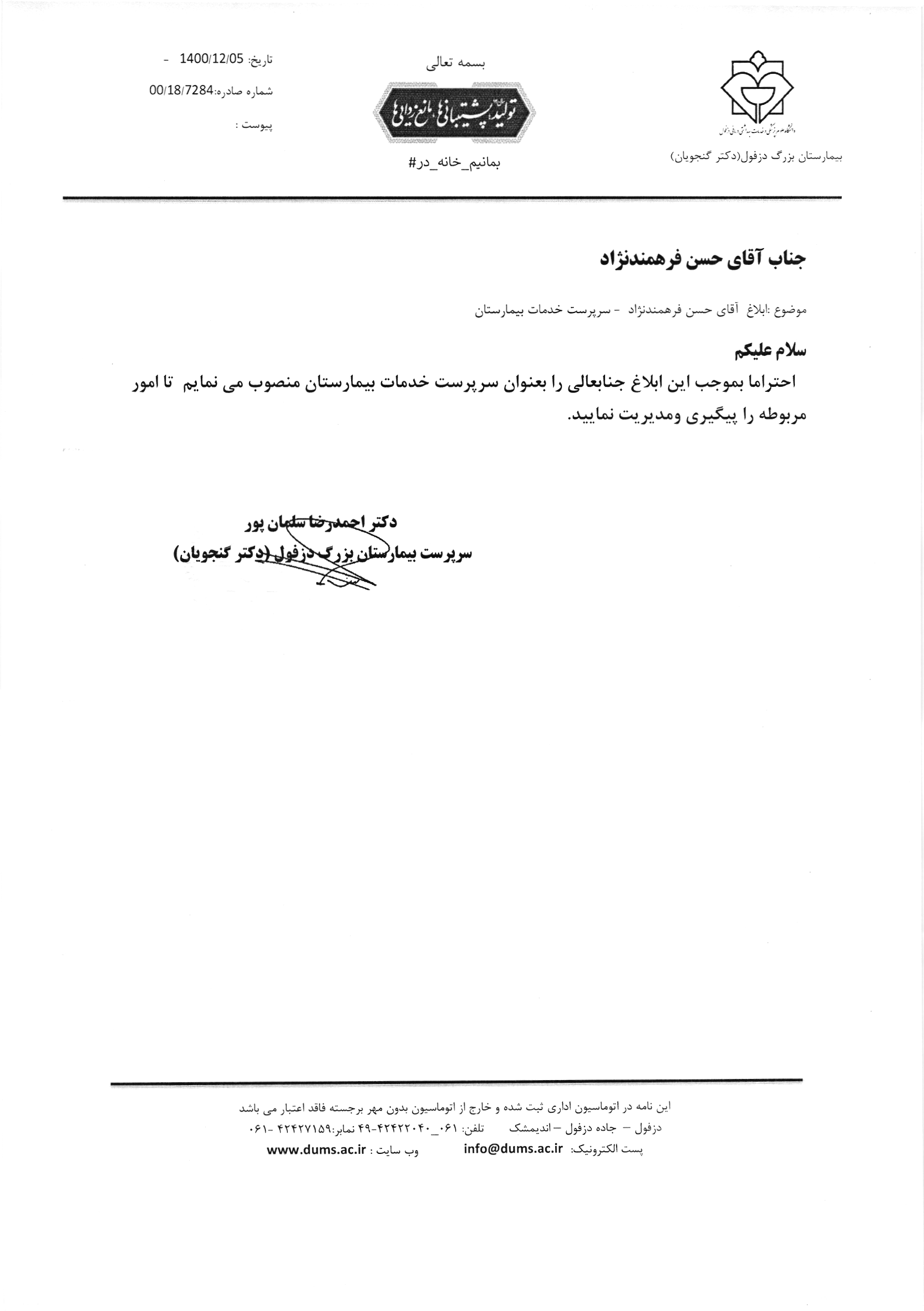 به گزارش روابط عمومی بیمارستان بزرگ دزفول دکتر احمدرضا سلمان پور رئیس بیمارستان طی ابلاغی حسن فرهمندنژاد را به سرپرستی خدمات بیمارستان منصوب کرد.