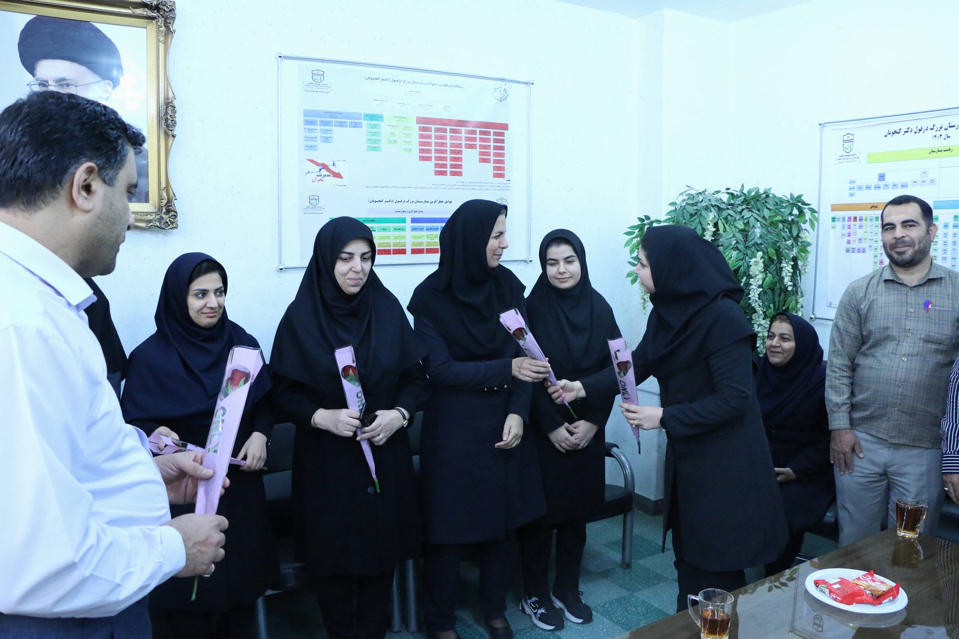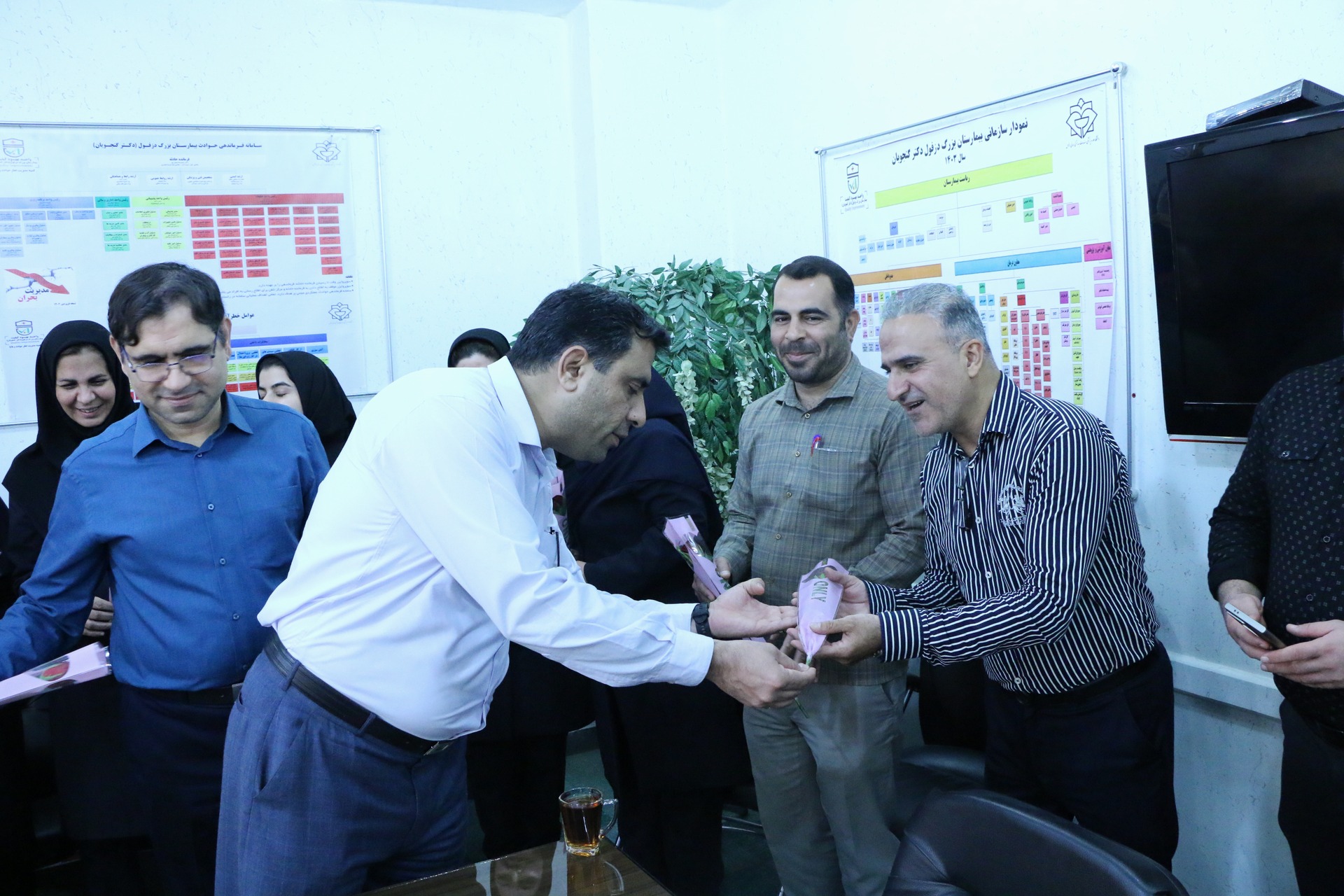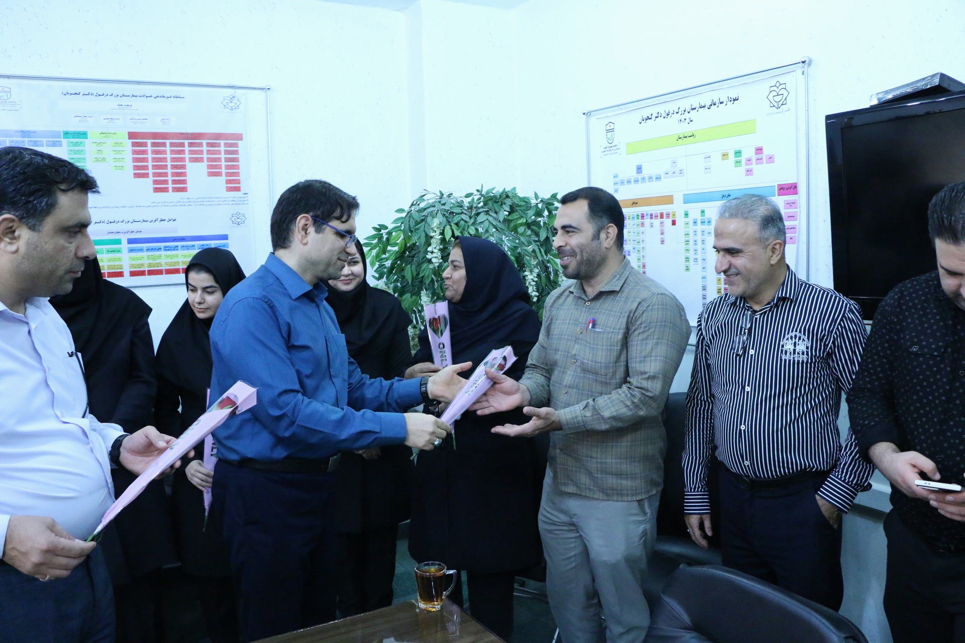 به گزارش روابط عمومی بیمارستان بزرگ دزفول(دکترگنجویان):نظر به فرا رسیدن چهارم شهریورماه در هفته دولت که  روزکارمند نام‌گذاری شده است دکتر شفیعی نیا رئیس بیمارستان طی آیینی در دفتر ریاست  ضمن تقدیر وتشکر از زحمات همکاران خود در واحد امور اداری بیمارستان به شرح گزارش تصویری ذیل با اهدای گل این روز را به همکاران خود تبریک گفت.