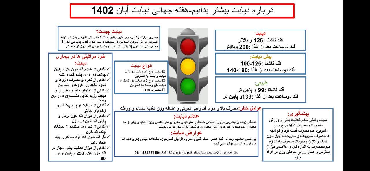به گزارش روابط عمومی بیمارستان بزرگ دزفول  با فرارسیدن هفته ی جهانی دیابت ایستگاه سلامت به همت دفتر آموزش سلامت بیمارستان برگزار شد.نظر به شعار امسال "شناخت عوامل خطرو اقدام موثر" در این ایستگاه که در سالن انتظار همراهان برگزار شد با انجام قندخون ، فشارخون و...آموزش های خودمراقبتی نیز داده شد همچنین این برنامه تا پایان هفته ی دیابت در بخش های مختلف بیمارستان جهت آموزش به بیماران و همراهان آن ها ادامه دارد.